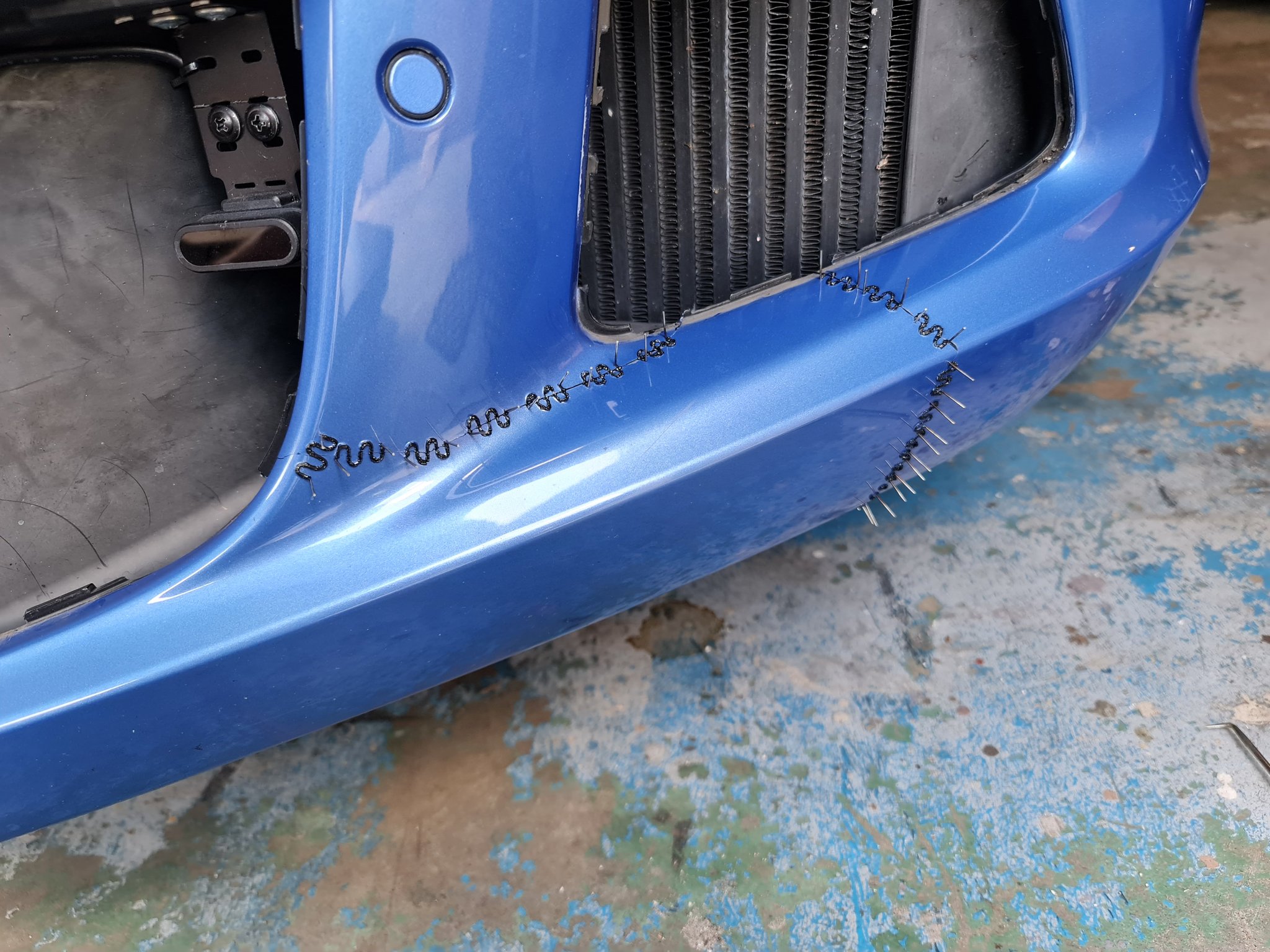 Right-side bumper crack repaired and prepped for refinishing — matching the left side repair.