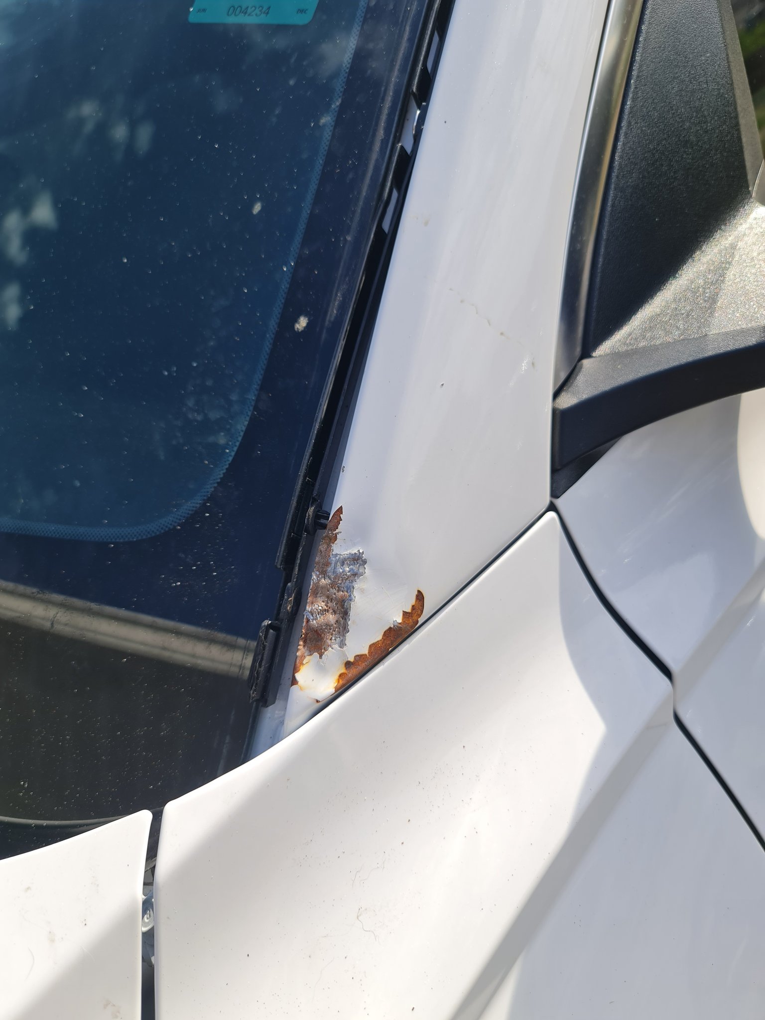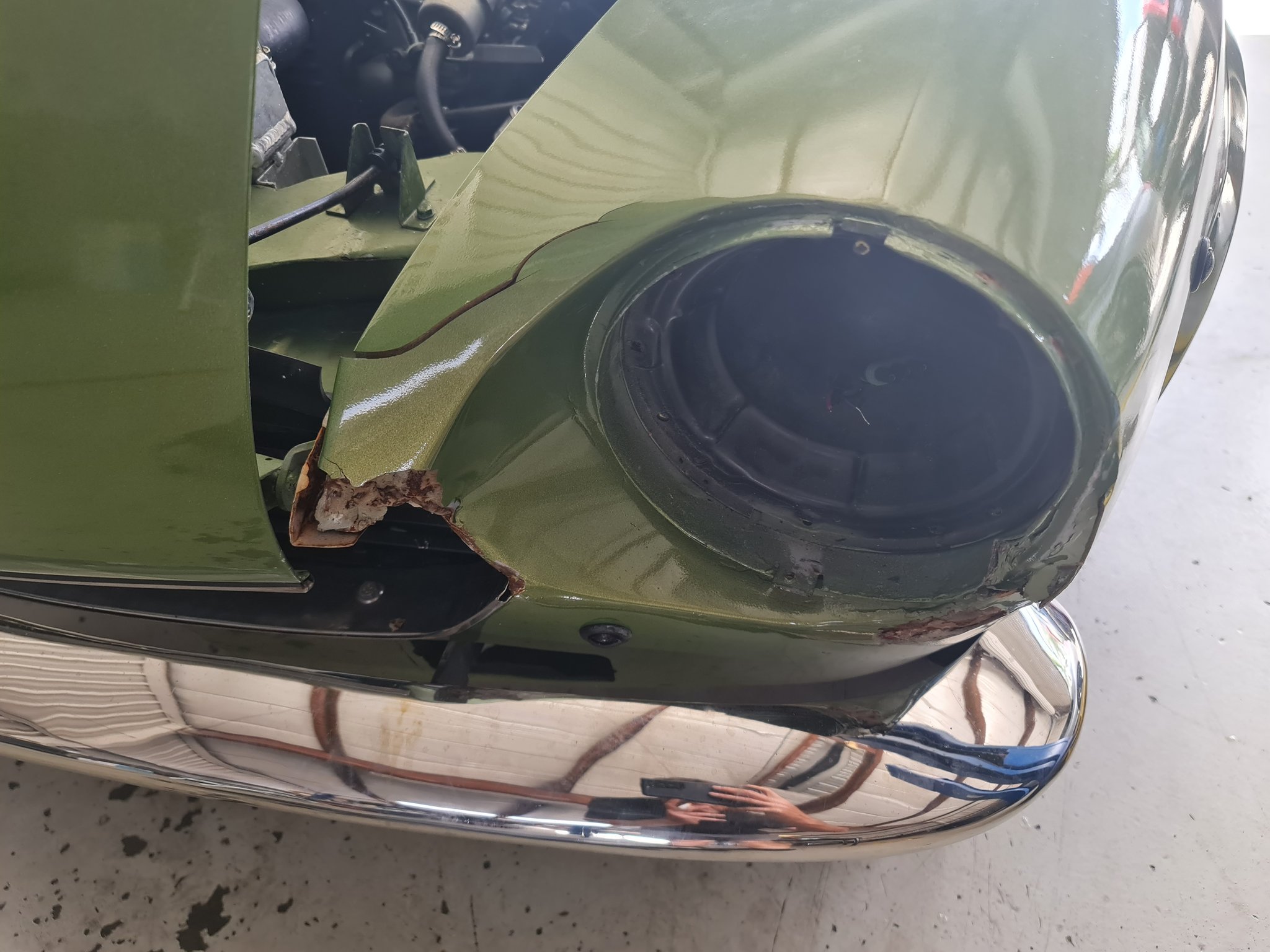 Rust and paint damage near the windshield — hood stripped, prepped, and repainted to factory finish.