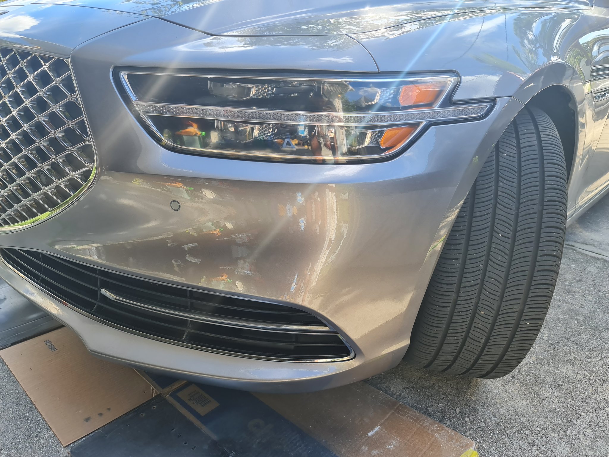 Genesis sedan bumper repaired and blended seamlessly with surrounding panels.