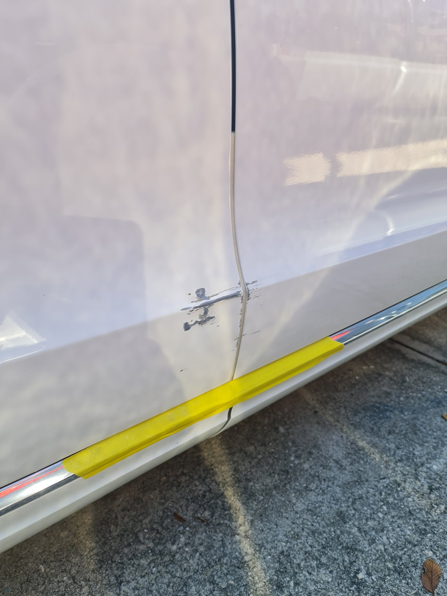 Deep body scratch filled and refinished — invisible repair on factory paint.