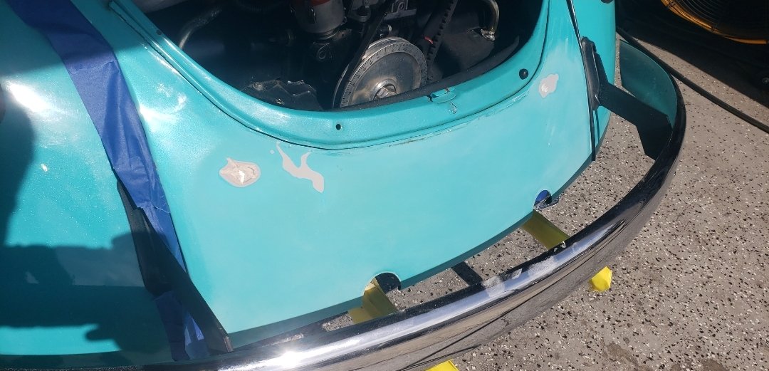 Classic VW Beetle rear lid — body filler work completed and surface restored for paint.