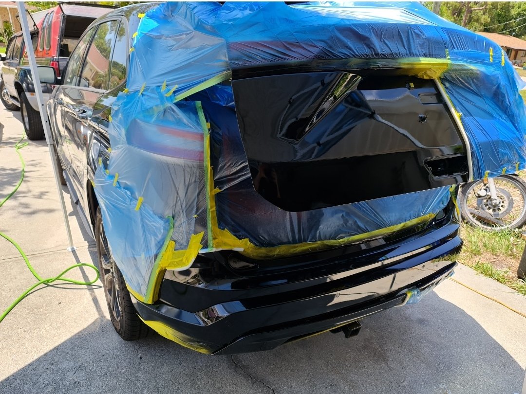 Rear hatch and bumper with extensive paint chipping — prepped and masked for a full professional repaint.