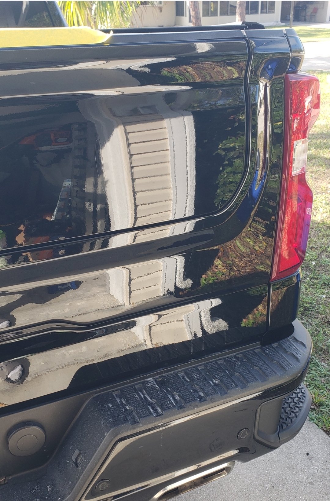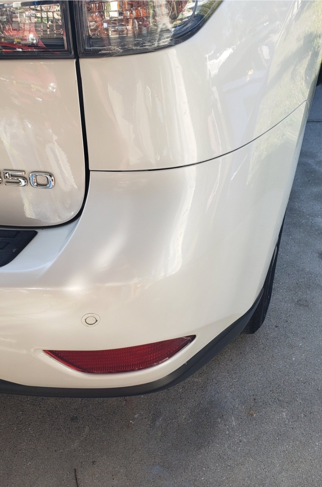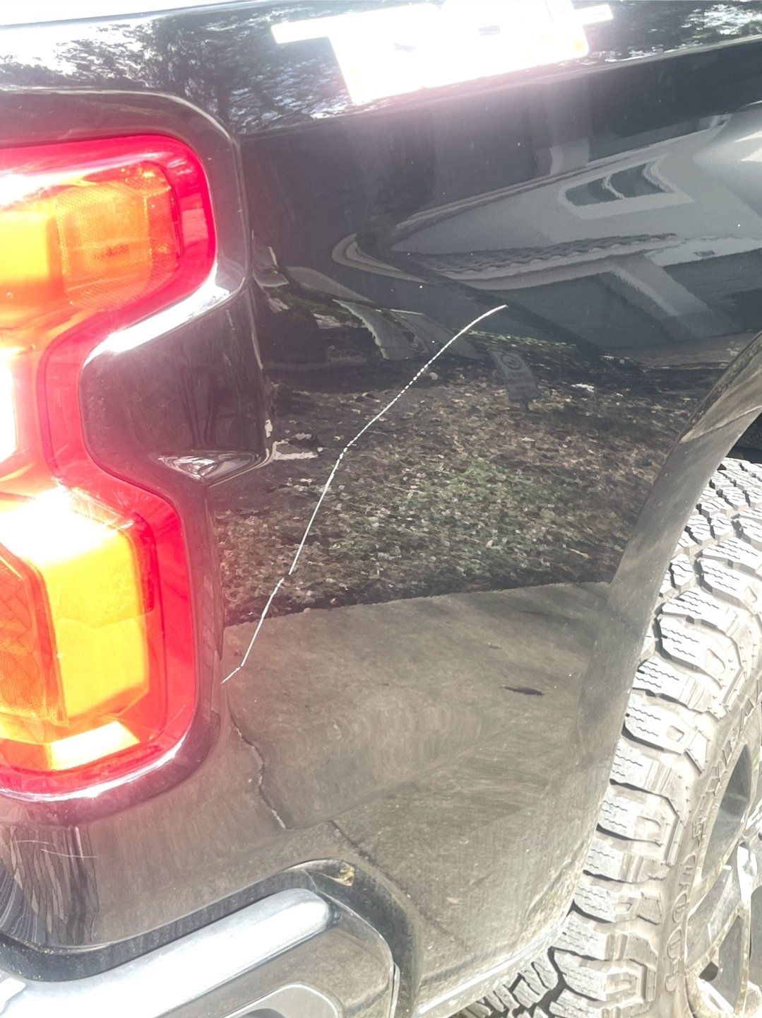 Deep scratch near the taillight area blended and refinished to match the original paint.