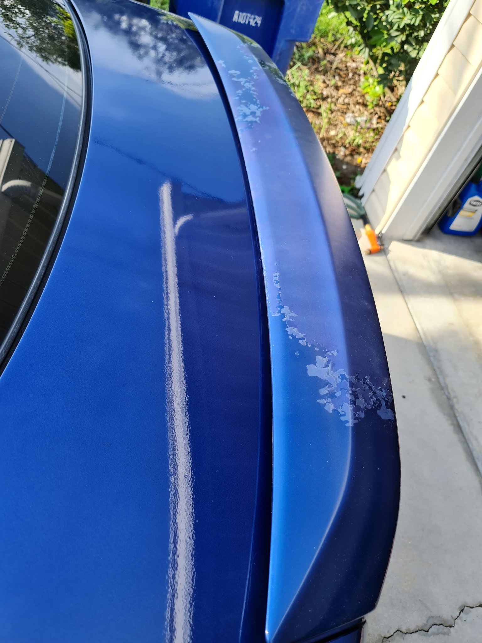 Peeling spoiler paint stripped and refinished with durable clear coat protection.