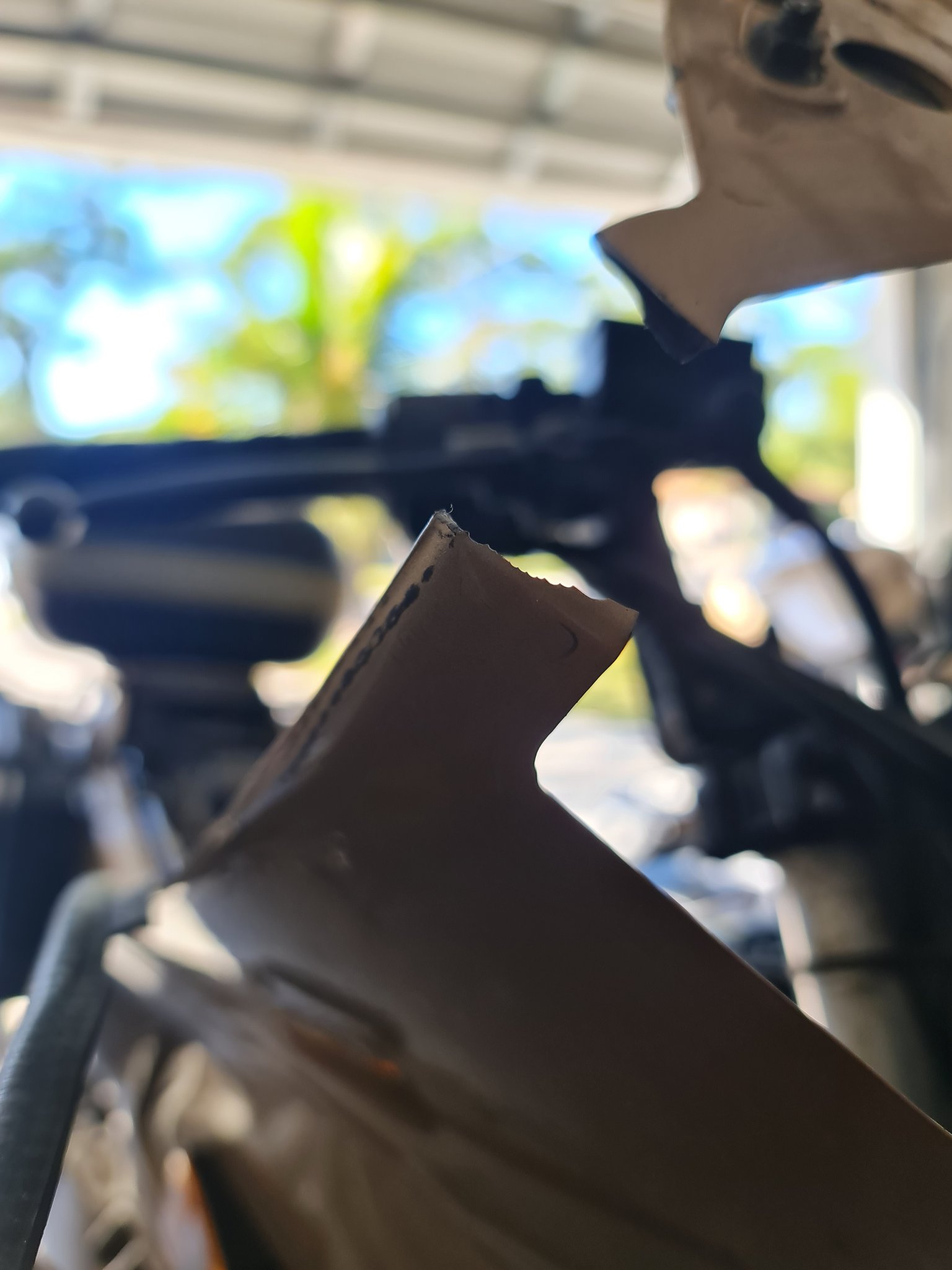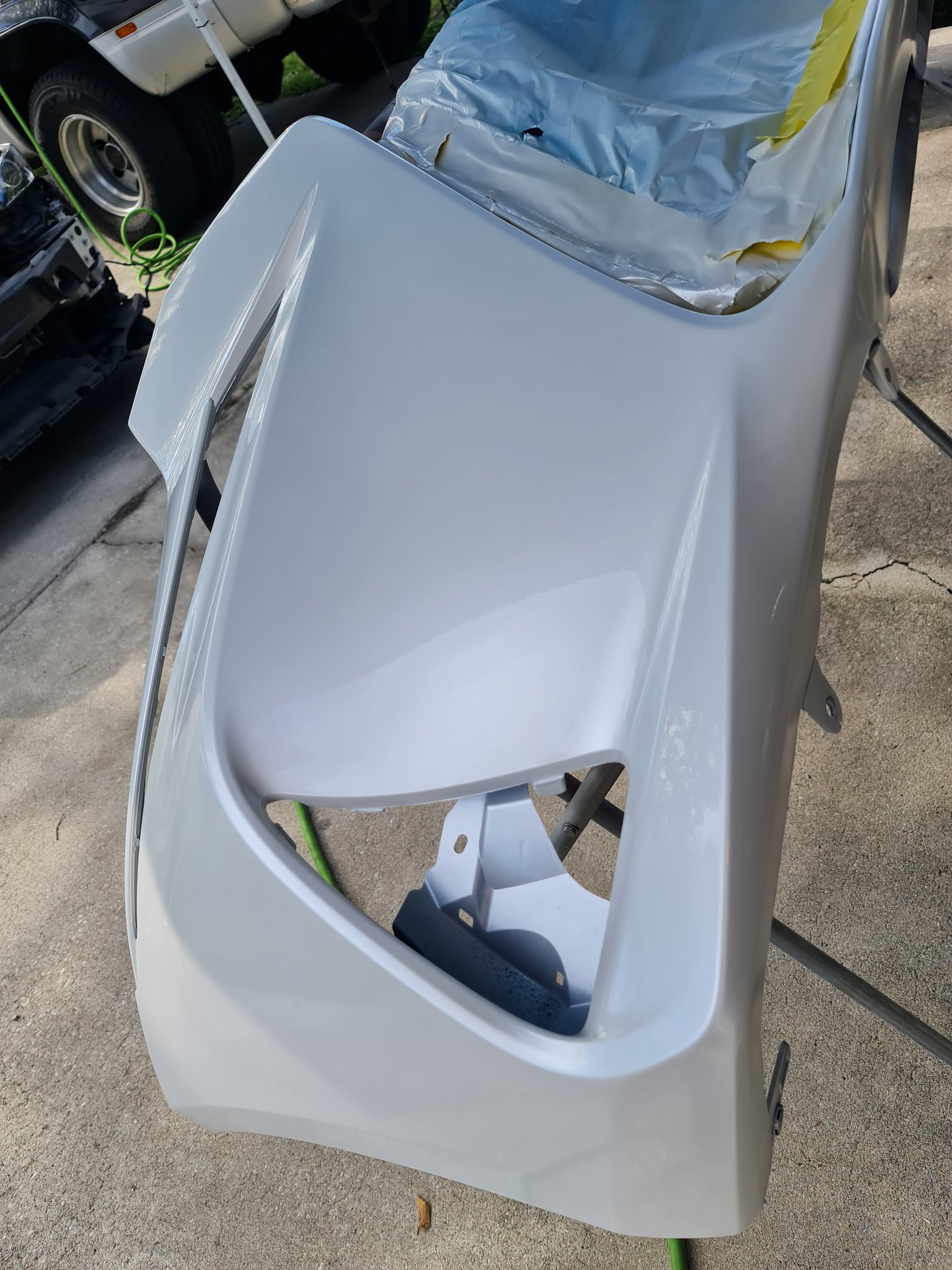 Damaged motorcycle fairing repaired, primed, and refinished to match factory color.