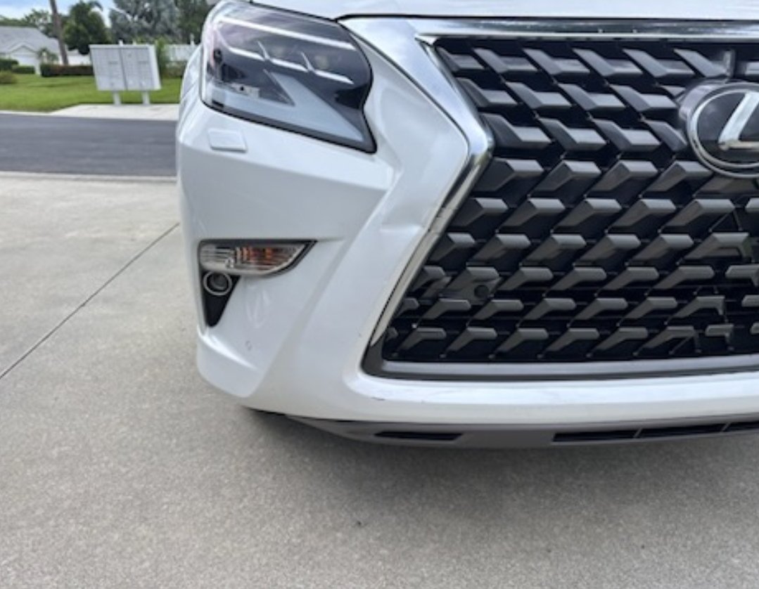 Bumper dent and grille damage repaired — front end restored to showroom quality.